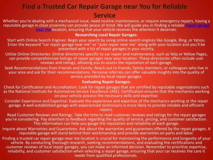 In conclusion, choosing a trusted garage fix near you involves careful consideration of various factors, such as qualifications, experience, and recommendations. By following the guidelines Artikeld in this comprehensive guide, you can rest assured that your vehicle is in good hands.